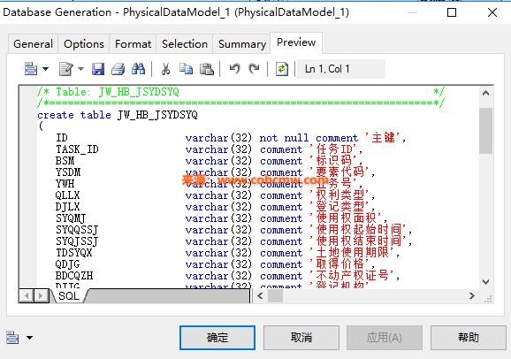 2.点击”Database -> Database Generation”的Preview选项卡,点击保存按钮,保存产生的sql脚本到本地。