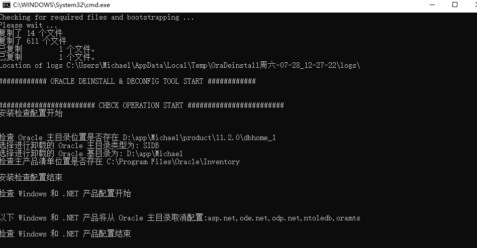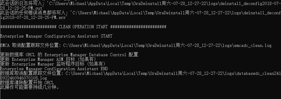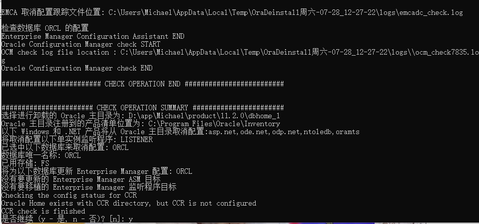 在你的安装目录下找到deinstall.bat(参考我的:D:\app\Michael\product\11.2.0\dbhome_1\deinstall),右键以管理员身份运行。中间除了一次输入y,其他都是直接回车就好。
