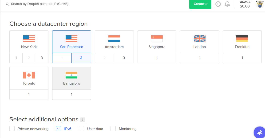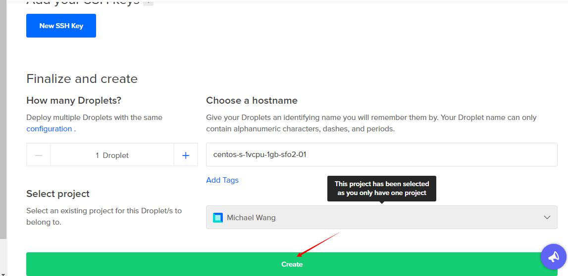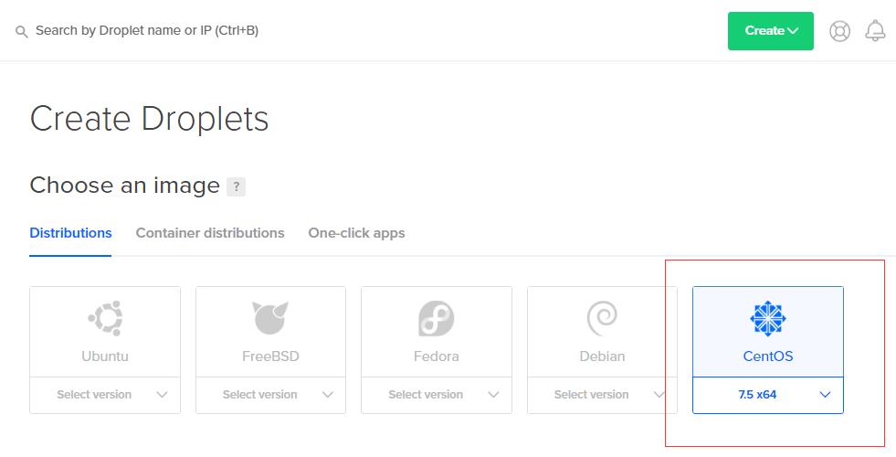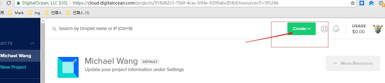 登录成功后点击”Create”按钮创建一个”Droplet”。