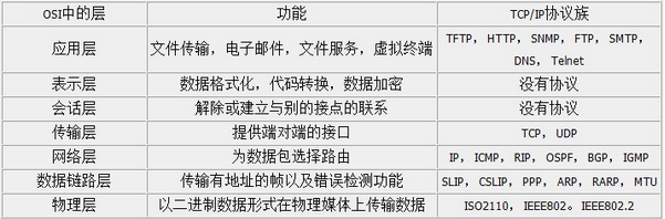 我们需要知道TCP工作在网络OSI的七层模型中的第四层——Transport层,IP在第三层——Network层,ARP在第二层——Data Link层;在第二层上的数据,我们把它叫Frame(帧),在第三层上的数据叫Packet(包),第四层的数据叫Segment(段)。 同时,我们需要简单的知道,数据从应用层发下来,会在每一层都会加上头部信息,进行封装,然后再发送到数据接收端。这个基本的流程你需要知道,就是每个数据都会经过数据的封装和解封装的过程。 在OSI七层模型中,每一层的作用和对应的协议如下: