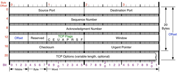 Offset:给出首部中32 bit字的数目,需要这个值是因为任选字段的长度是可变的。这个字段占4bit(最多能表示15个32bit的的字,即4*15=60个字节的首部长度),因此TCP最多有60字节的首部。然而,没有任选字段,正常的长度是20字节;