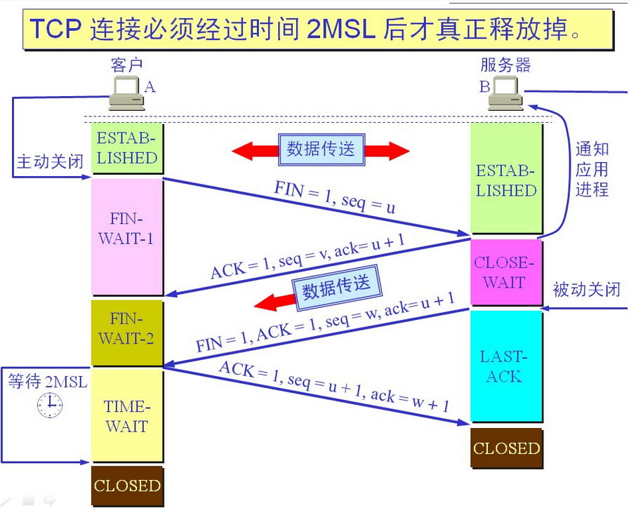 第二:就是为了防止上一节提到“已失效的连接请求报文”出现在本连接中。主机1发送完最后一个ACK的报文后,再经过2MSL就可以是本连接持续的时间内所产生的所有报文都从网络中消失。这样就可以是下一个新的连接中不会出现这种旧的连接请求报文。不然的话,如果没有这个等待时间,那么万一立刻就有新的连接建立的需求,那么新的连接建立起来,上一次的报文还在网络中没有完全的消失,这样的话两次的报文就混在一起了,等待的这个时间就是延缓下次连接的建立时间,让本次的报文彻底的消失在网络中。