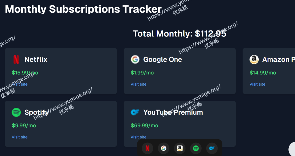Subs是一个简单的开源订阅成本跟踪器,名为”Subs”。它提供了一个直观的用户界面,可以轻松地添加、编辑和删除订阅,并计算每月的总成本。相比较Wallos而言,功能简单点,只能按月统计。