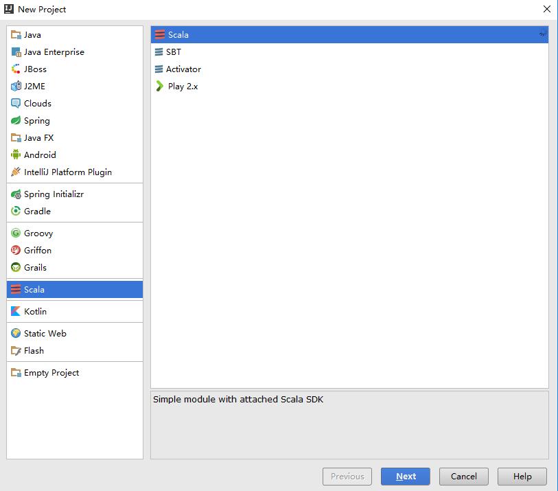 1.首先运行Idea程序,点击File –>New –>Project新建一个Scala工程,如下图;