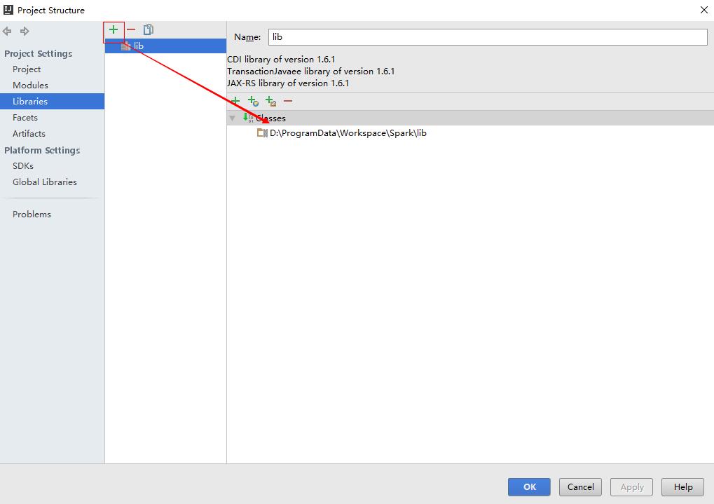 2.在工程根目录下,新建一个目录lib,用来引入需要的jar文件,然后在File –> Project Structure –>Libraries中把目录添加进去,如下图: