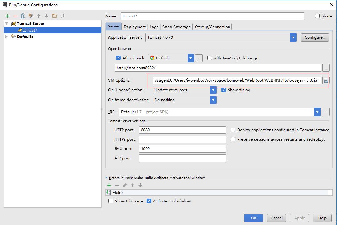 3.在你的IDE里指定运行参数:-javaagent:C:/Users/Workspace/bomcweb/WebRoot/WEB-INF/lib/loosejar-1.1.0.jar(需要替换为你的路径),我用的是Intellij IDEA ,操作如下: