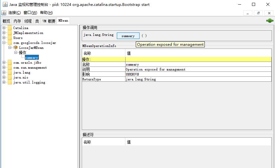 6.在连接后的窗口中,选择MBean下的com.googlecode.loosejar,点击summary,即可查看到分析结果了;