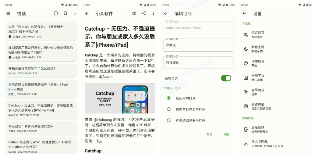 - 三种阅读模式:阅读器、应用内标签页、系统浏览器