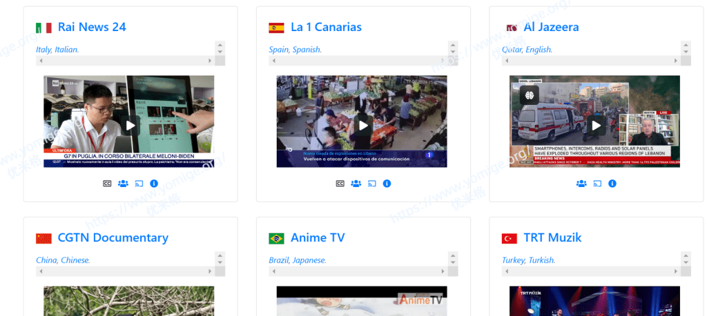 一个在线网站,可以通过该平台观看各种语言的新闻、娱乐、纪录片等内容,涵盖多种频道,如意大利的 Rai News 24、西班牙的 La 1 Canarias、卡塔尔的 Al Jazeera、中国的 CGTN 纪录片频道等。