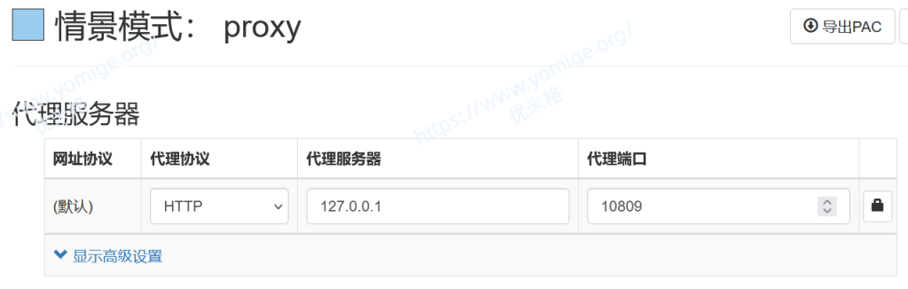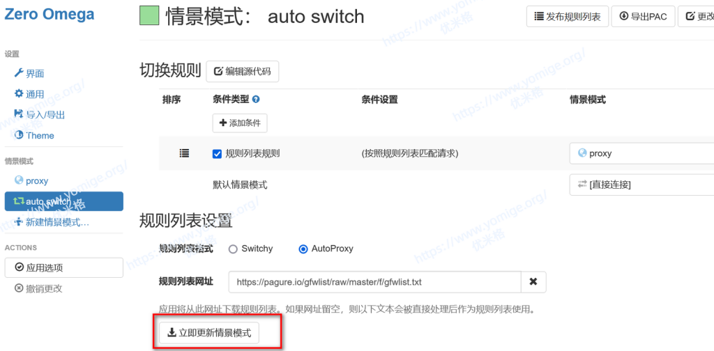 然后是配置,主要是根据你的客户端代理服务端口及协议,填写一个代理配置,然后再增加一个自由切换的规则列表,规则列表使用开源公共项目gfwlist的地址即可: