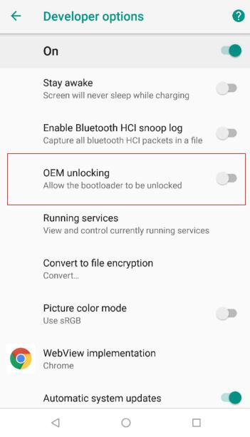 到手机设置里的开发者选项中,找到OEM unlocking选项,并启用,如下图: